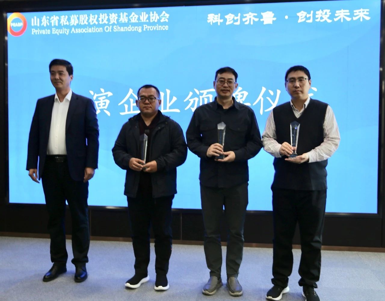 路演完成后现场举行了颁牌仪式。山东省私募股权投资基金业协会副会长、济南财投基金集团党委委员、副总经理刘光明为路演项目颁发了“科创齐鲁·创投未来”路演入选企业奖牌。