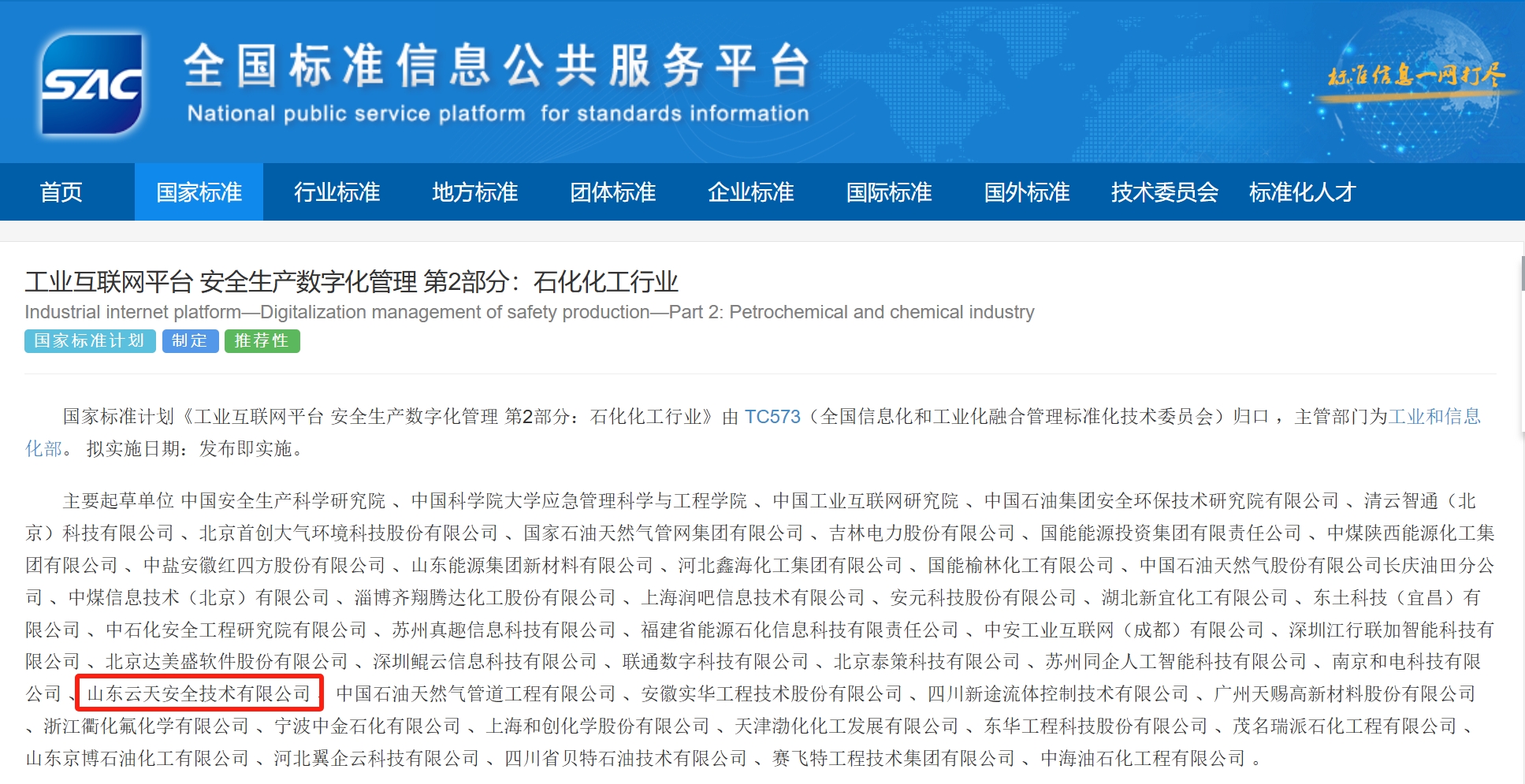 近日,国家市场监督管理总局(国家标准化管理委员会)正式批准发布两项具有重要意义的国家标准——GB/T 46884.2-2025《工业互联网平台 安全生产数字化管理 第2部分:石化化工行业》与GB/T 43553.2-2025《智能工厂数字化交付 第2部分:设计交付》。澳门太阳城app作为核心起草单位之一,全程参与了这两项标准的研制工作,标志着公司在工业互联网安全与智能数字化交付领域的技术实力与实践经验获得了国家层面的高度权威认可。