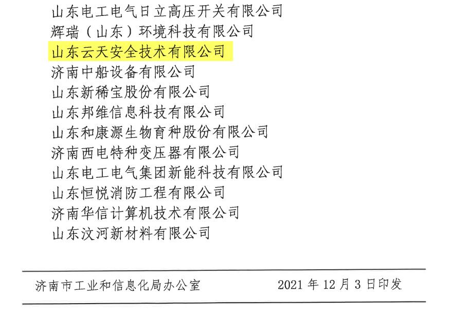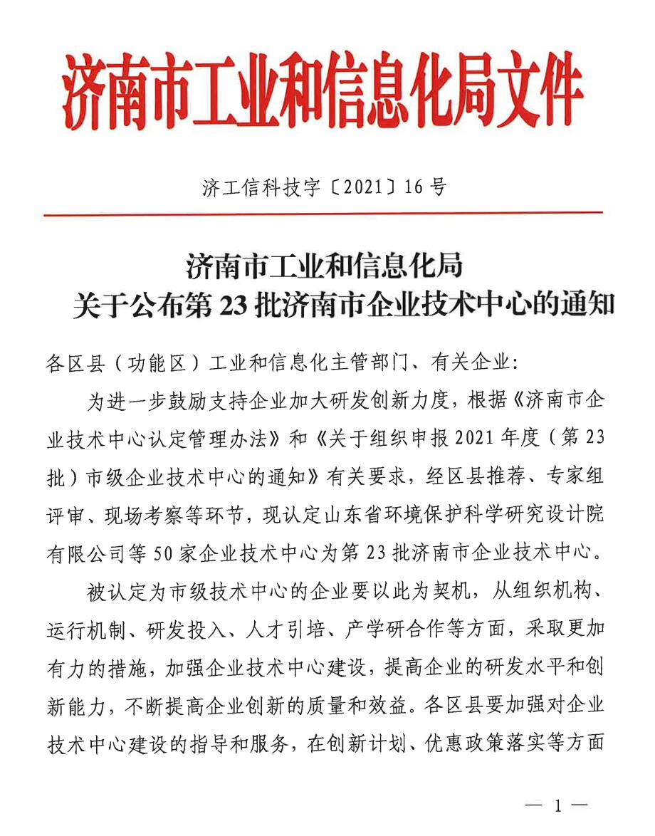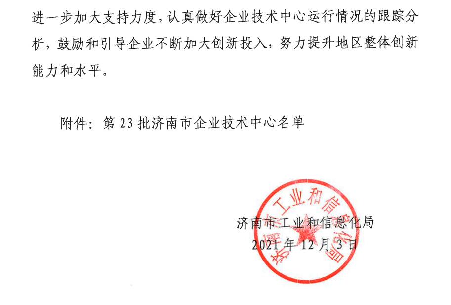 12月3日,济南市工业和信息化局下发了《关于公布第23批济南市企业技术中心的通知》(济工信科技字〔2021〕16号)文件,经过区县推荐,专家组评审,现场考察等环节,严格评审和依法公示后,认定太阳城app为“济南市企业技术中心”。