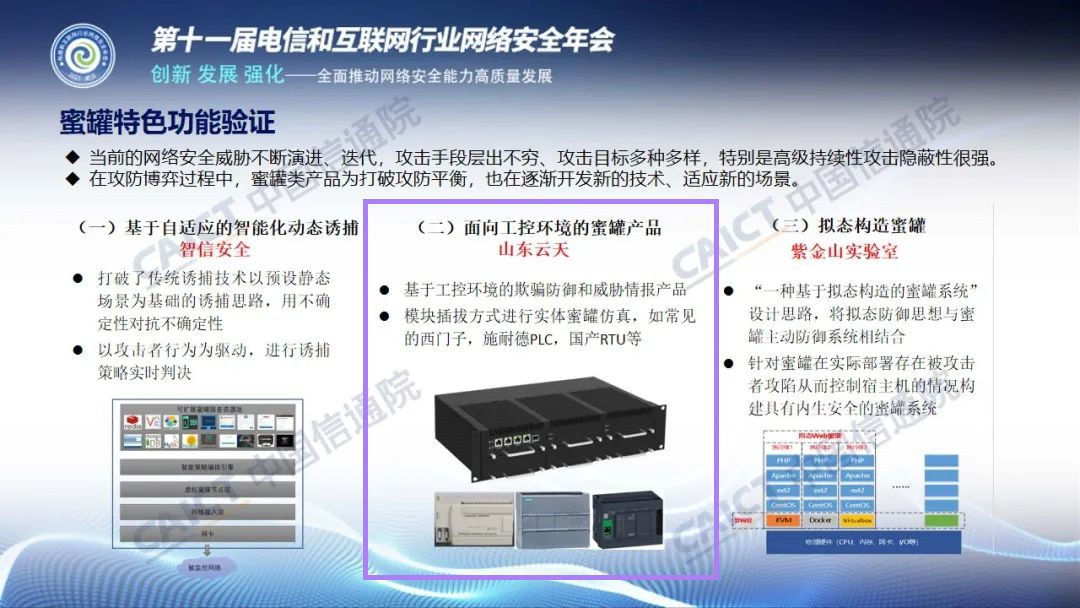 近日,中国信息通信研究院(以下简称“中国信通院”)安全研究所在“2021年(第十一届)电信和互联网行业网络安全年会-创新安全技术论坛”发布并解读了《国内威胁诱捕(蜜罐)类产品研究与测试报告(2021年)》。