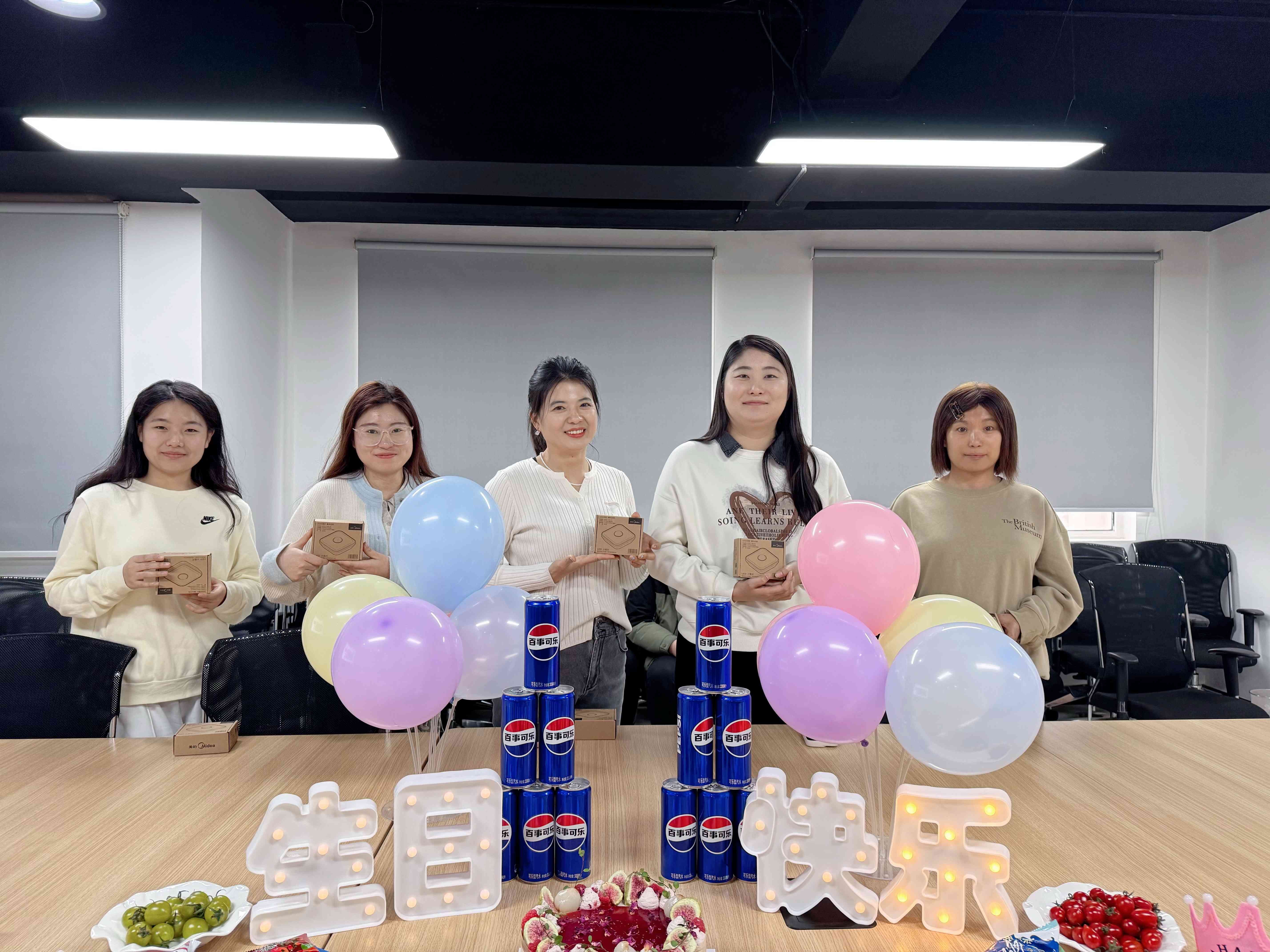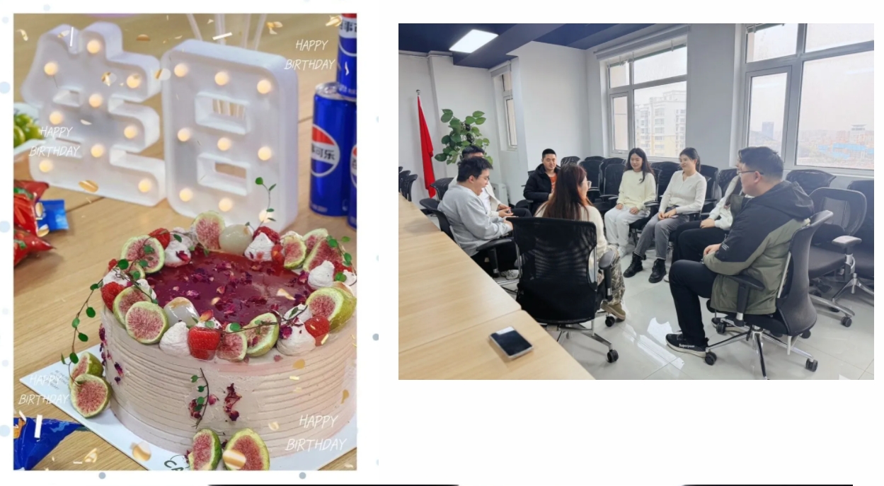 精心布置的会场中,绵软香甜的蛋糕与缤纷鲜果交织出甜蜜的盛宴。同事们笑语盈盈,齐聚一堂,为寿星们送上饱含心意的祝福。