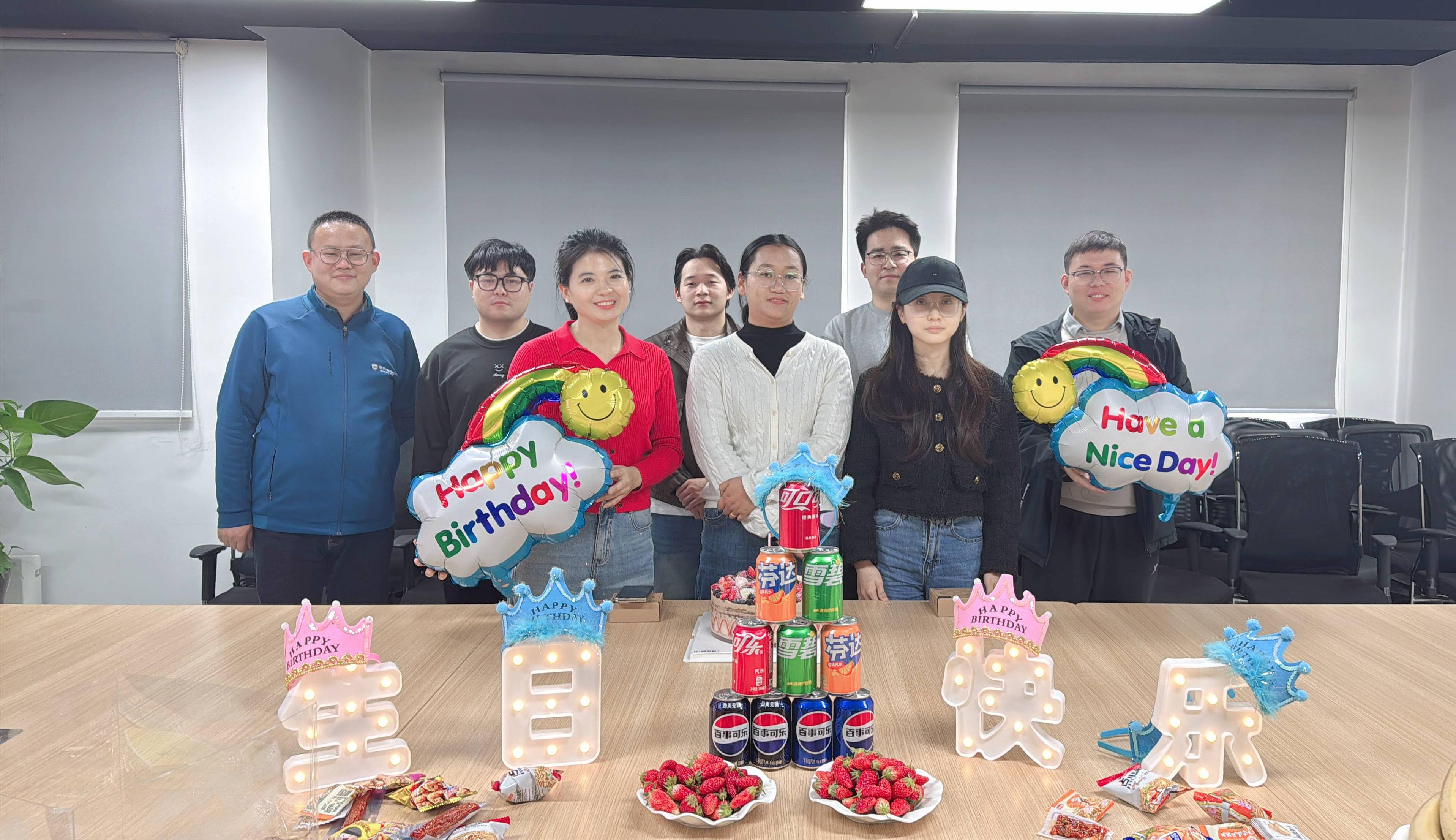 生日会的序幕,由一场精心筹备的下午茶温柔拉开。香甜软糯的生日蛋糕点缀着春日元素,散发着治愈的甜蜜香气;新鲜饱满的水果色彩缤纷,精致点心错落摆放,爽口小吃一应俱全,空气中弥漫着轻松愉悦的氛围,也藏着公司对每一位伙伴的用心与关怀。在全体同事的掌声与欢笑中,寿星们一同登场,每一张脸上都洋溢着幸福的笑意,成为春日里最动人的风景。