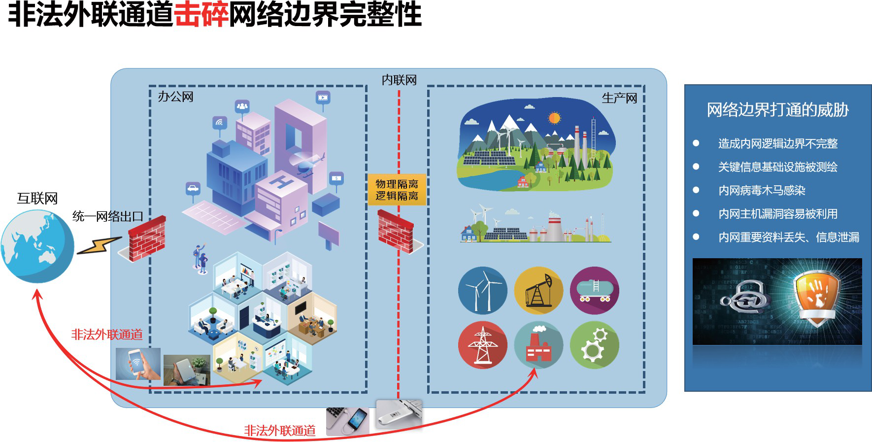 随着信息化网络化的快速发展,关键信息基础设施作为事关国家安全和社会稳定的重要战略资源的地位日益凸显。为了更好地应对威胁关键信息基础设施的网络恶意扫描、入侵等网络攻击事件,贯彻落实《中华人民共和国网络安全法》及《网络安全等级保护条例》中关于提升关键信息基础设施保护的要求, 关键信息基础设施网络运营单位应具备网络边界完整性检查能力,能够对内部网络用户私自联接外部网络的行为进行检查,准确定出位置,并对其进行有效处置。 非法外联通道击碎了网络边界完整性,为此,公安部第一研究所设计研发了“网络违规外联稽查系统” (简称网联E01),改变了传统客户端Agent检查模式,基于内网流量分析监测,即可对用户从”可信域”到“非可信域”非授权行为进行日常化、无感知稽查,可及时发现隐患,防患于未然。