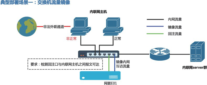 网联E01 部署在核心交换机旁,每台交换机对应一台网联E01