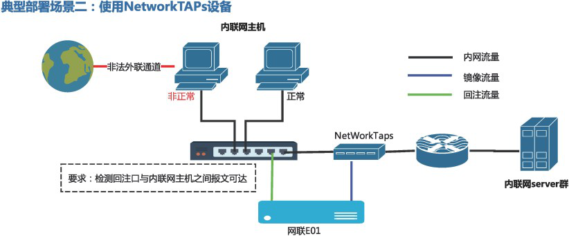 每台网联E01需要接两个核心交换机网口及NetworkTAPs设备一个镜像口
